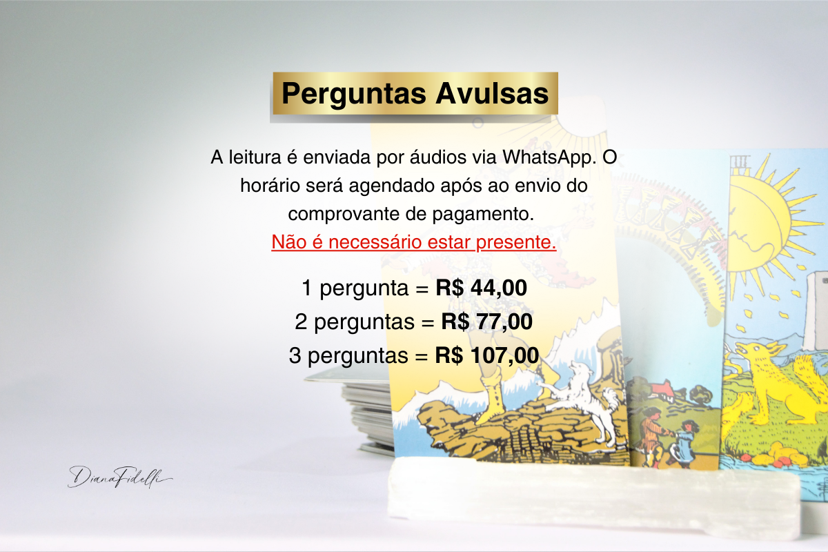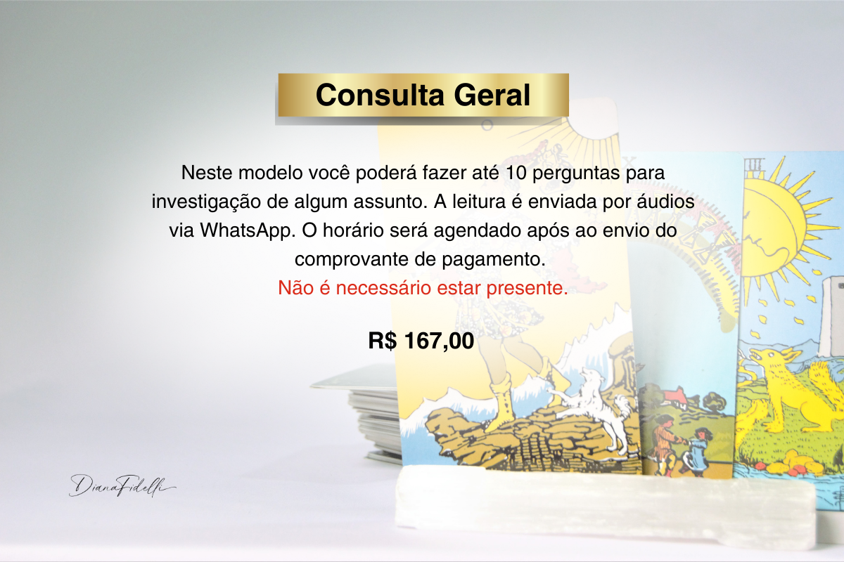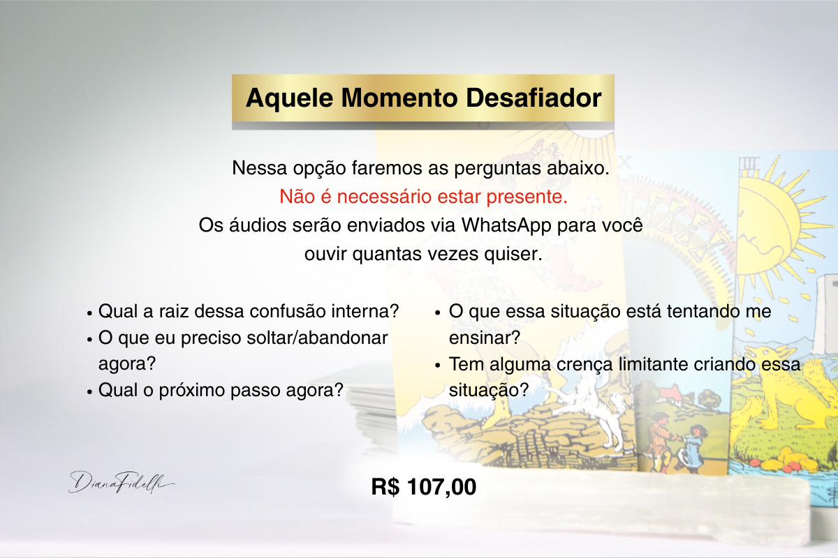 Durante a sessão, utilizo o Tarô como um espelho da sua alma para revelar o que está no seu campo energético e inconsciente. É um processo acolhedor, esclarecedor e transformador.