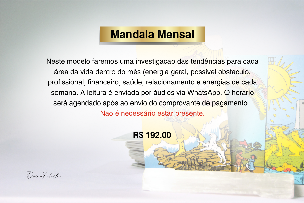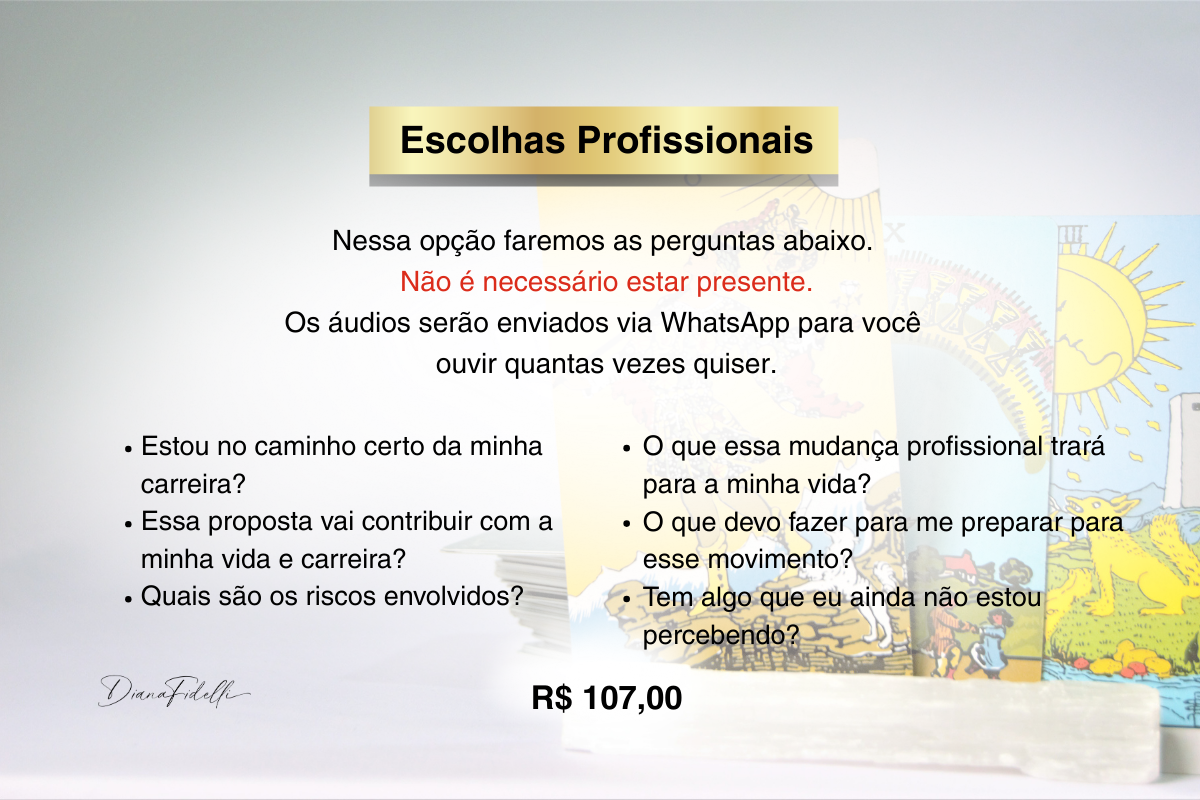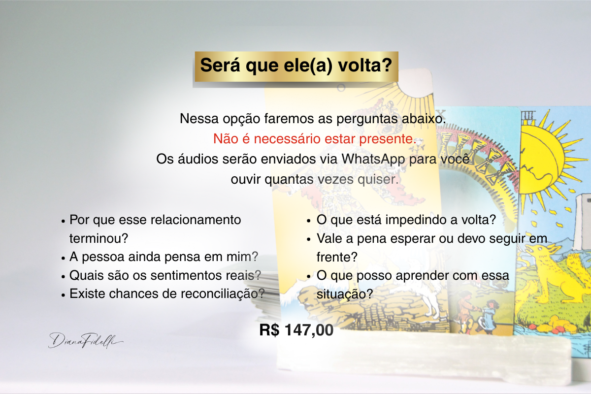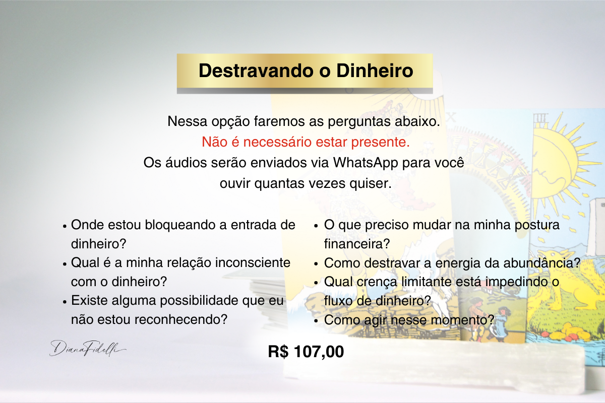 Durante a sessão, utilizo o Tarô como um espelho da sua alma para revelar o que está no seu campo energético e inconsciente. É um processo acolhedor, esclarecedor e transformador.